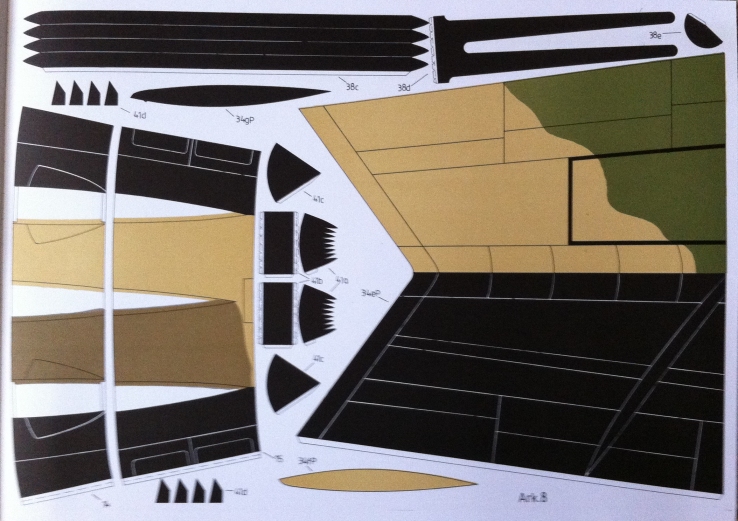 | The rest of the kit consists of 21 pages printed on what seems to be 110-pound paper (slightly thicker than a standard index card). These are mostly the parts that will form the skin of the model. This picture shows a page that is about 16 x 12, and contains one wing tip and some parts that go on the aft section of the fuselage under the horizontal tail. |