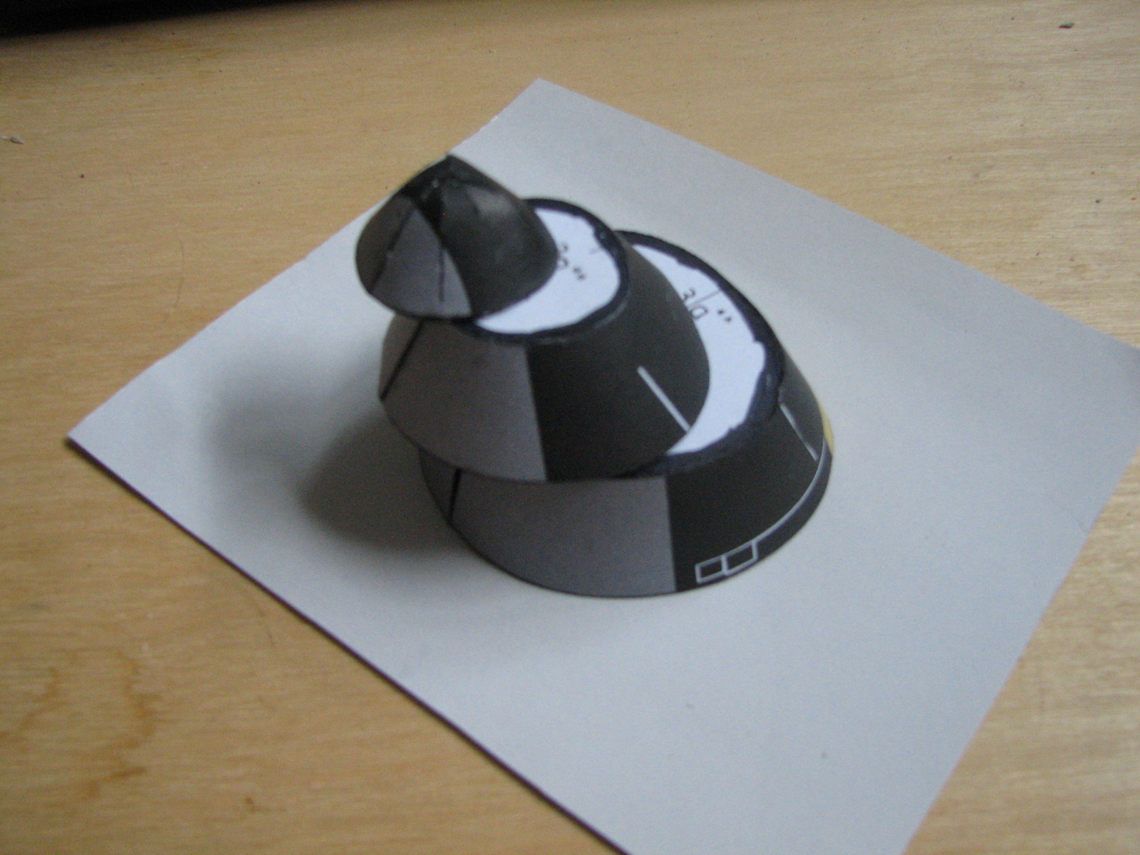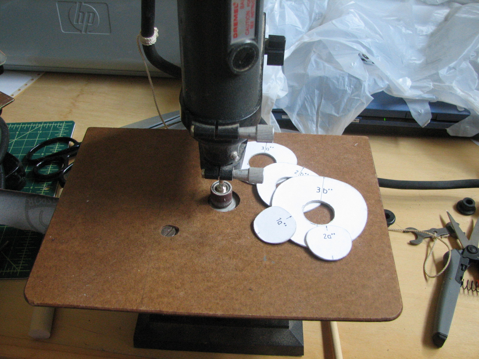 | I used a Dremel tool mounted in a drill press attachment. I cut out a piece of masonite, drilled a hole in it, and attached it to the drill press table. This allowed me to lower a sanding drum into the hole so I could use it to finely shape the cardboard bulkheads. |