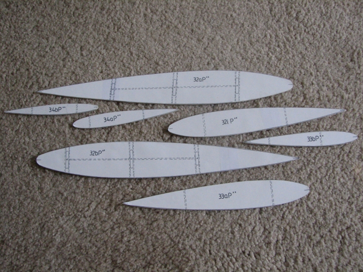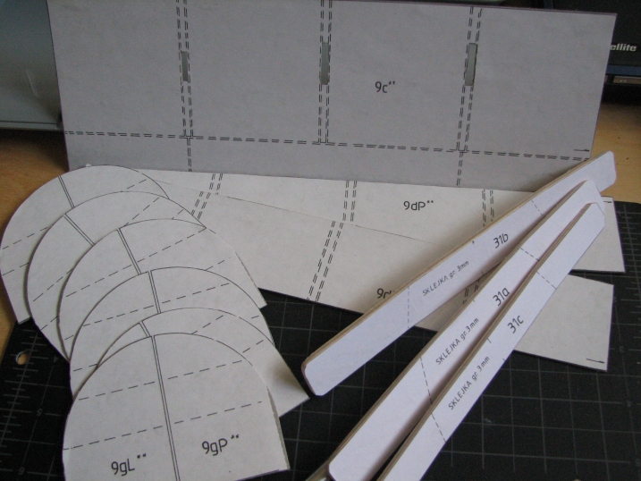 | The next part is the wing box. This is the structure in the fuselage that supports the wings. The templates for these parts were printed on regular paper, and I glued most of them to 1 mm card board. If you look closely at the 3 long, narrow pieces on the right of this photo, you'll see that they are a little bit thicker. In accordance with the instructions, I glued these templates to 3 mm (approximately 1/8 inch) hobby plywood. |