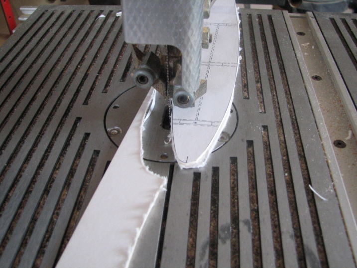 | I'm now starting the wings, and there are a bunch of wing ribs to cut out and glue to cardboard. I actually used my woodworking equipment for this step. In this picture, I'm cutting a wing rib out on my band saw. |