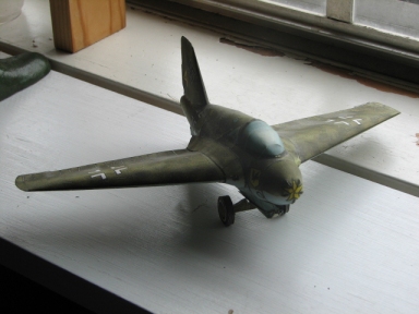This model af an Me 163 Komet came from Fiddler's Green. It was a rocket-powered interceptor developed by the Germans during World War II. It was used as a point defense weapon, intercepting B-17's on bombing missions over Germany. Its typical attack profile was to take off and climb vertically through the formation, then attack at very high (almost super sonic) speed on the way back down.