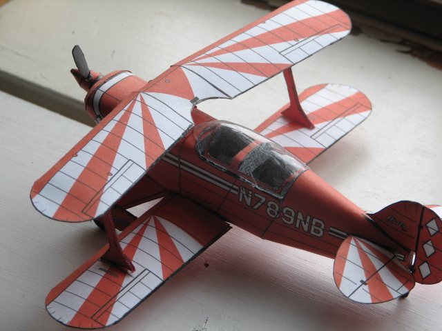 This is a model of the Pitts special. The entire kit is contained in a PDF document, so I had to make the canopy using a piece of clear plastic and a heat gun. You can also see cockpit elements like seats and instrument panels.