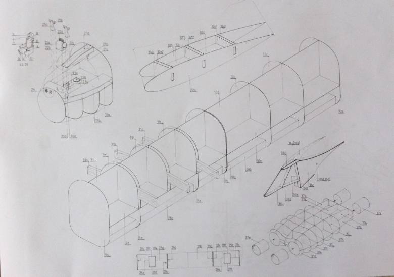| Actually, the biggest help at how to assemble the thing are two numbered drawings. These show the placement of internal bulkheads and sheets of "skin." Also, it's important to notice that they numbered the model pieces with a certain order using numbers and letters (for instance, 34a and 27b). The wings seem to be mostly in the 32, 33 and 34 range...engine pod parts all start with "37." The drawings and number groupings are the most helpful aspect. |