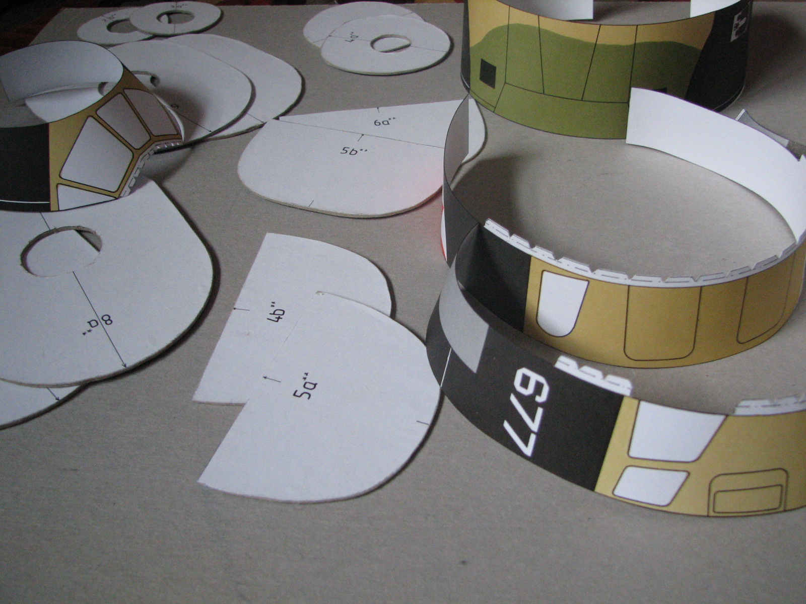 | The first step was to cut out all the bulkhead templates (printed on normal-weight paper), and glue all those parts to a large piece of cardboard (about the same weight as the cardboard on the back of a writing tablet. Then I cut all those pieces out using heavy scissors and a hobby knife, using whichever worked best for each situation. |