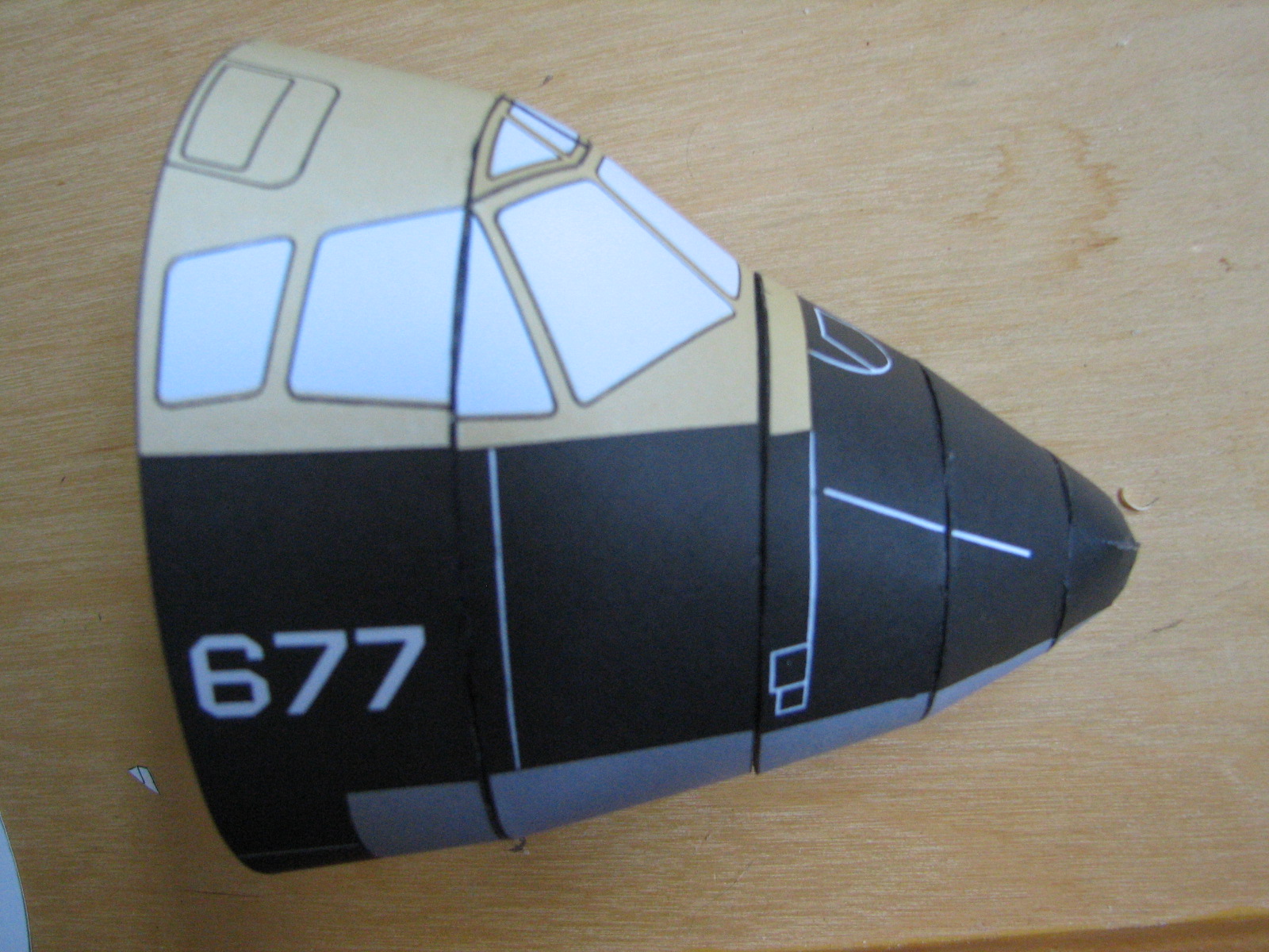| The piece in the middle of this picture is the one from the previous step. These three sections make up everything in front of the cockpit window. |