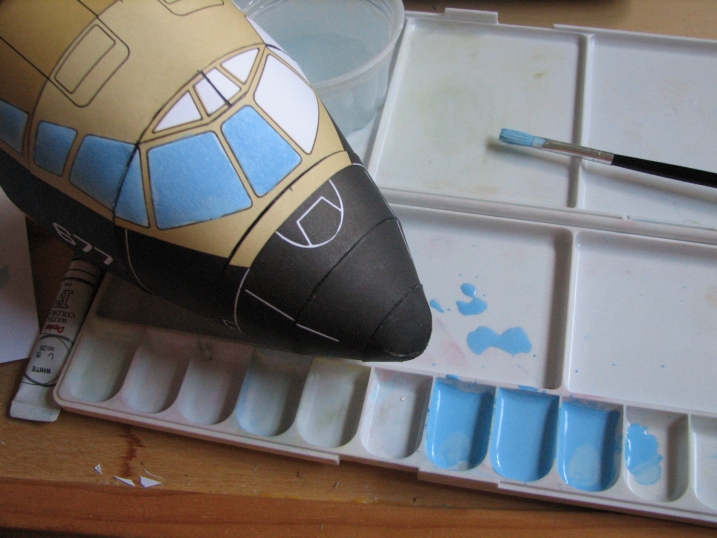 | Since I decided to not to do the cockpit interior, I was left with the white cockpit windows. So, I mixed up some water color paints to get a sky blue color. While sky blue is not what it would really look like from the outside (it would be dark grey or black in reality), I've seen the blue color on other models. It conveys the "window" appearance well. |