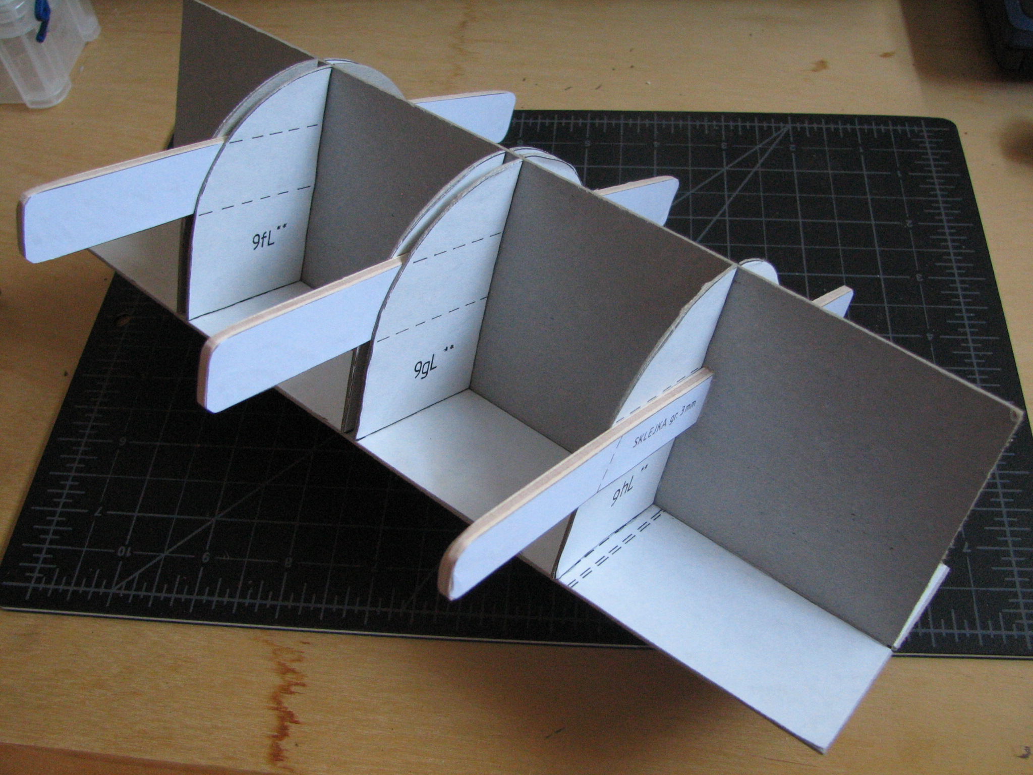 | The next part is the wing box. This is the structure in the fuselage that supports the wings. The templates for these parts were printed on regular paper, and I glued most of them to 1 mm card board. If you look closely at the 3 long, narrow pieces on the right of this photo, you'll see that they are a little bit thicker. In accordance with the instructions, I glued these templates to 3 mm (approximately 1/8 inch) hobby plywood. |