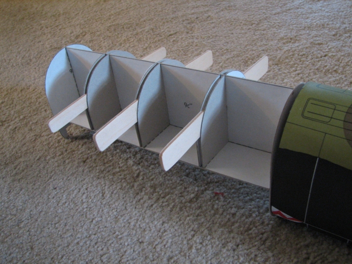 | Here's the wing box, almost completely finished. You can see the 3 mm plywood spars that extend through the wing box and will support the wings on either side of the fuselage. |